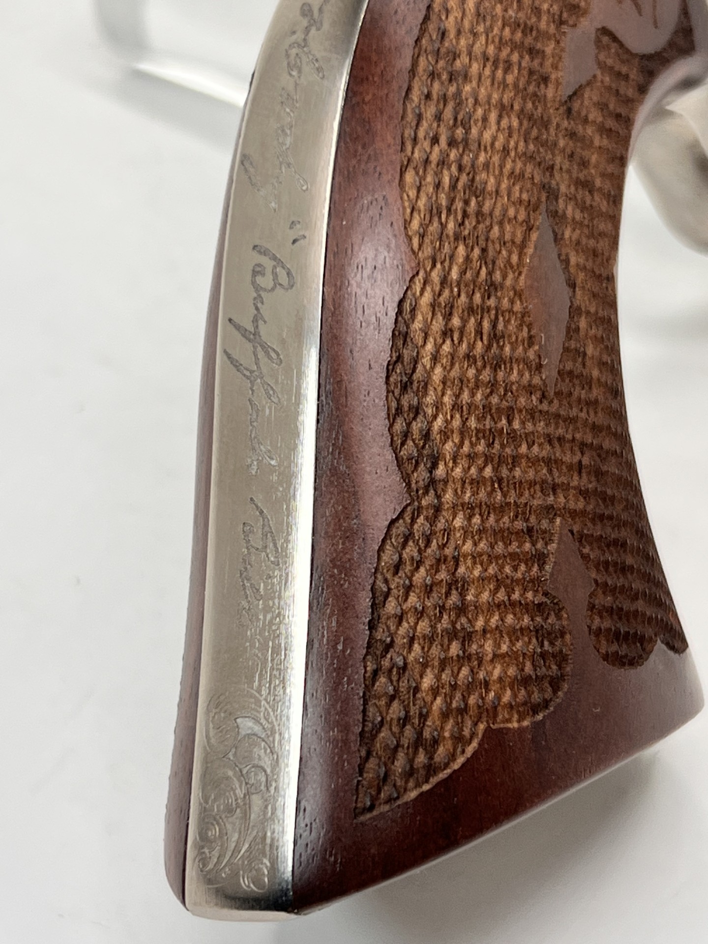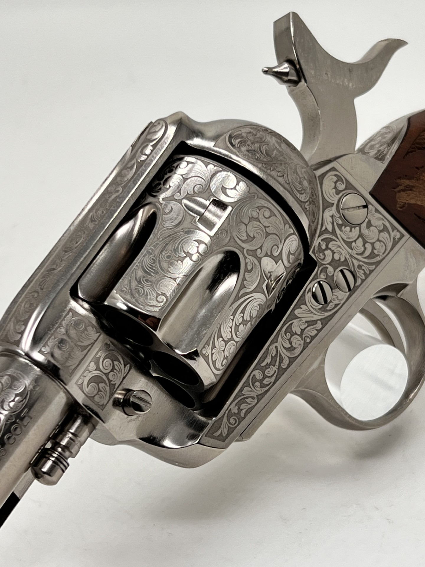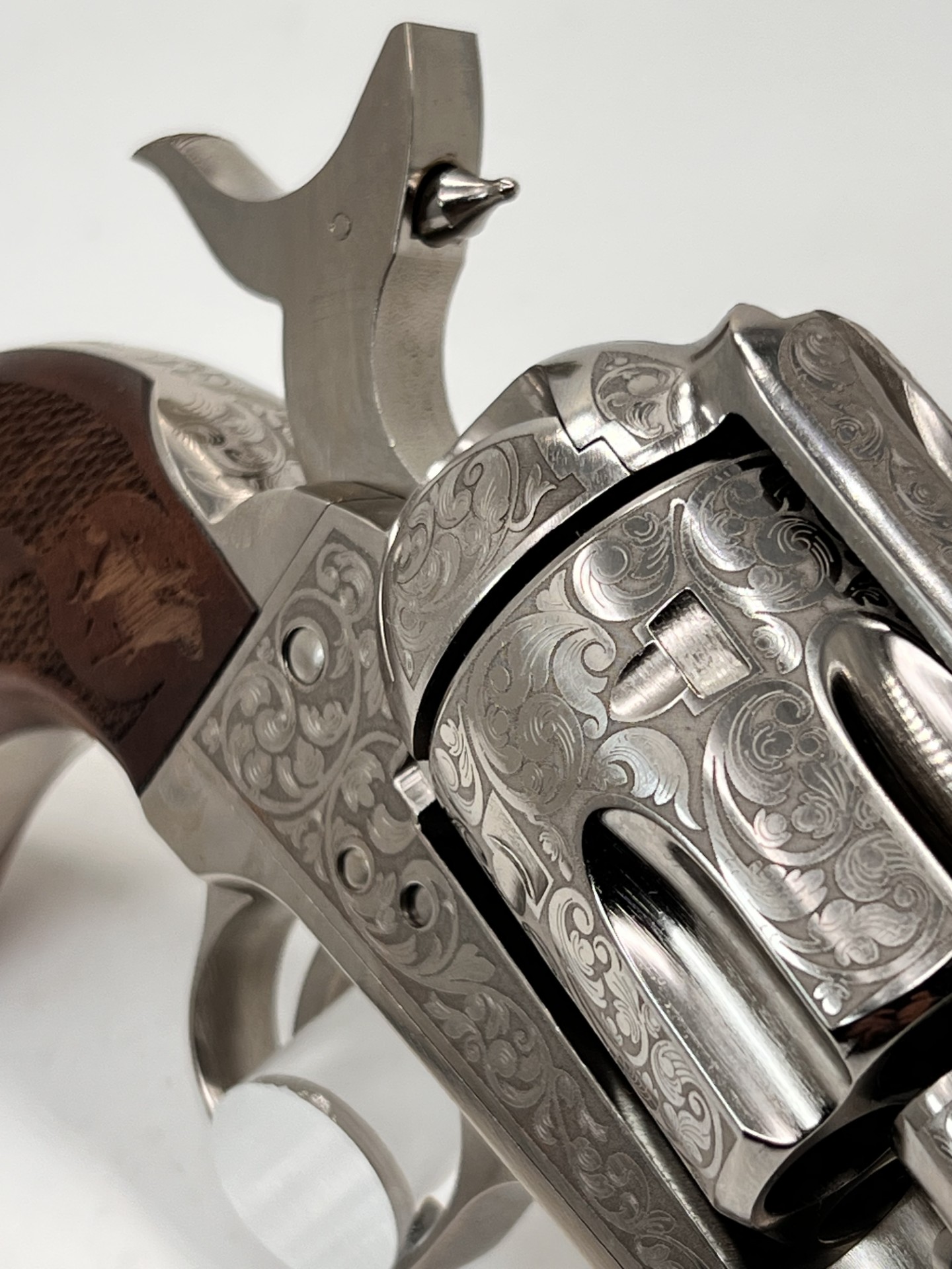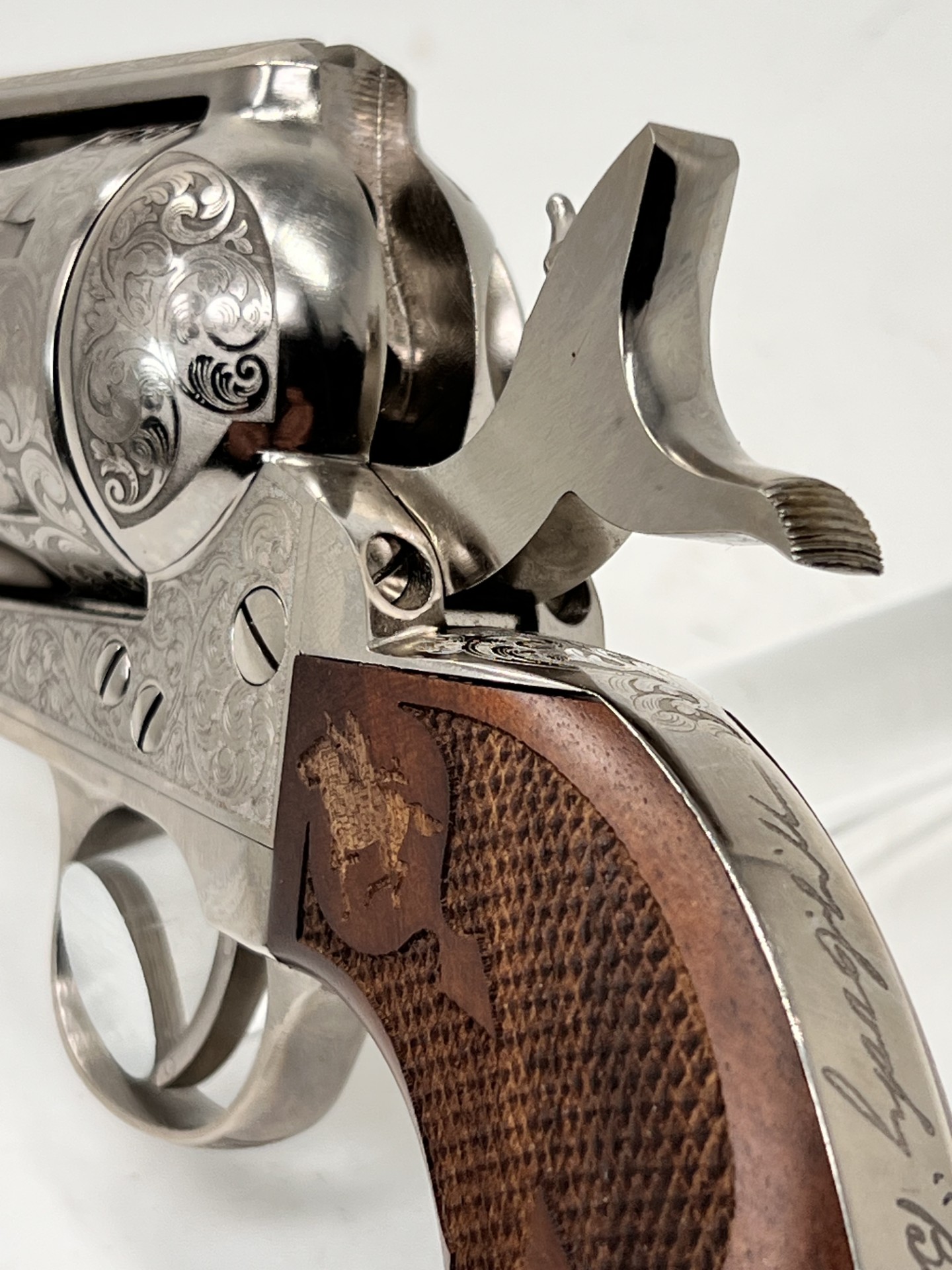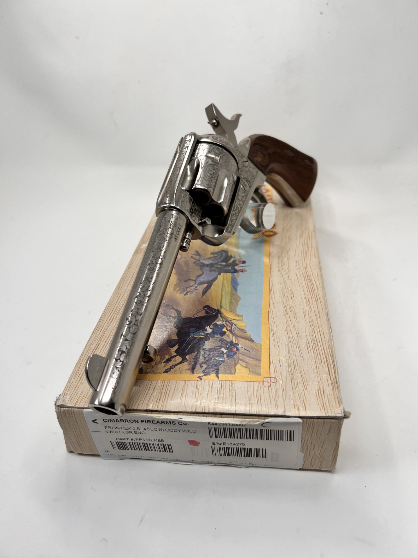 Cimarron Firearms honors William Frederick “Buffalo Bill” Cody with the Cody Wild West Frontier Model, in tribute of Bill’s original Colt Peacemaker in .45 Long Colt. Cimarron’s Buffalo Bill tribute has a nickel finish and features a backstrap engraved with Buffalo Bill’s signature, exquisite 90% coverage laser engraving and a handsomely checkered walnut grip. The action is incredibly smooth and its accuracy will amaze you. This 5.5” barreled Peacemaker revolver is an exacting replica down to the same weight, size, performance and feel. It has a floating hammer pin as opposed to safety transfer bar and the iconic 4 clicks to bring the hammer to full cock.