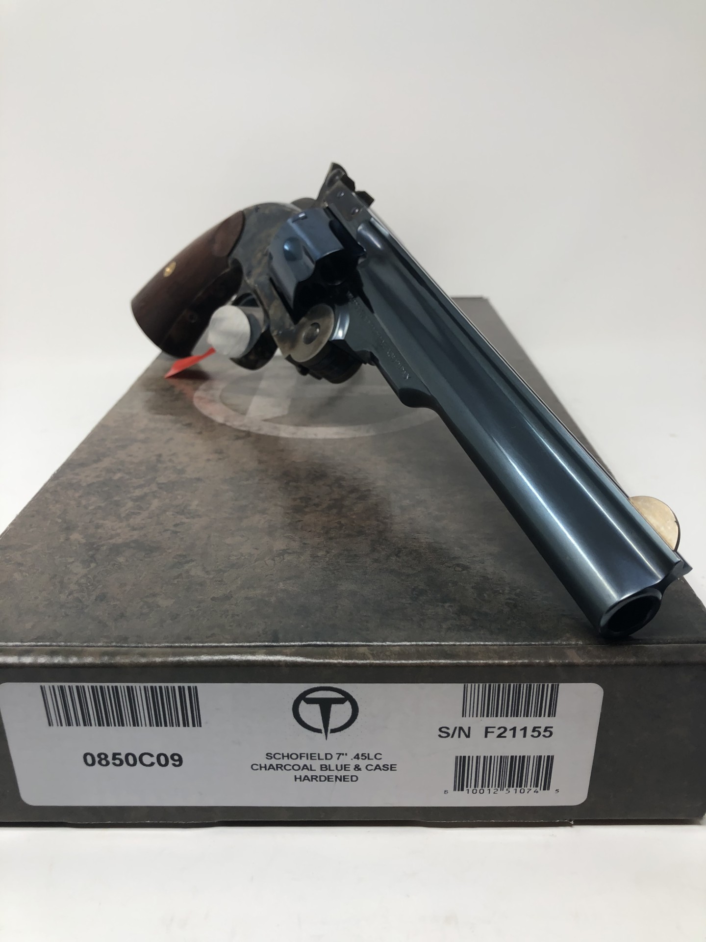 Designed by Major George Schofield to be operated with one hand while on horseback, a break-open pistol was ideal for mounted soldiers in the U.S. Cavalry. Shooters could easily eject all six spent cartridges and reload while on horseback. The top break pistol also proved useful to the likes of Jesse James and Wild Bill Hickok. The Schofield barrel latch opens by pulling it back with the thumb and includes the rear sight notch. This 7″ barreled model features a forged steel color cased hardened frame, charcoal blued finish with various color case hardened parts and a two-piece walnut grip with cartouche. Chambered in the venerable 45LC.