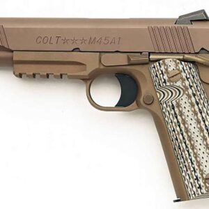 New COLT M45A1 CQBP MARINE 1911 RAIL Gun - .45 ACP - 5" NAT'L MATCH BARREL - DESERT TAN DECOBOND™ PVD Finish - Model# O1070M45 The Colt Rail Gun, or Colt Marine Pistol, has been selected by the United States Marine Corps as their Close Quarters Battle Pistol (CQBP), marking the first time since WWII that a Colt 1911 is being shipped to the United States Government. To honor the brave men and women of the U.S. Marine Corps, the Colt Marine Pistol is available in limited quantities. This pistol features Novak 3-dot night sights, an enhanced hammer, a Colt extended ambidextrous safety lock, a 5″ National Match barrel, a MIL-STD 1913 accessory rail and a flat, serrated mainspring housing with a lanyard loop. Firearm Specifications: *Manufacturer: Colt *M45A1 *Caliber: .45 ACP *Barrel Length: 5″ *Receiver Material: Stainless Steel *Receiver Finish: Desert Tan Decobond™ PVD by Ionbond *Slide Material: Stainless Steel *Slide Finish: Desert Tan Decobond™ PVD by Ionbond *Sights: Novak Carry with Dots *Hammer: Enhanced *Trigger: Solid Aluminum *Safety Lock: Extended Ambidextrous *Grip Safety: Upswept Beavertail *Stocks: Composite *Ejection Port: Lowered and Flared *Action: Single Action *Firing System: 80 *Overall Length: 8.5″ *Approximate Weight: 40 oz. *Capacity: 7$1,909.00Original price was: $1,909.00.$1,786.00Current price is: $1,786.00. -