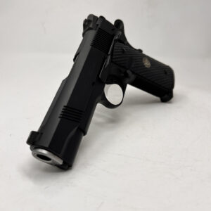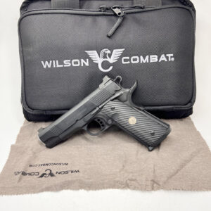 Used WILSON COMBAT 1911 CQB ELITE COMPACT - 4" MATCH GRADE CONE BARREL w/FLUSH-CUT REVERSE CROWN - 45ACP - BLACK ARMOR-TUFF® The Close Quarters Battle Elite blows the competition away with a standard package of custom features designed to meet the needs of tactical shooting professionals. The CQB Elite package has a standard array of custom features designed to meet the needs of tactical shooting professionals, each selected with the input of experts in the field. Here’s what is standard: Bullet Proof® parts throughout, serrations on the top and the rear of the slide, Battlesight rear sight with fiber optic front sight, matching serrations on the back of the extractor, checkered mainspring housing and front strap for a sure grip and standard G10 grips with a tapered cut-out for easy access to the semi-extended magazine release button. The CQB Compact Pistol has all the features of a full-size CQB but is reduced in size for carry purposes or for anyone who needs a smaller pistol. The slide on the CQB Compact is an inch shorter than a standard CQB, and the grip is ½" shorter, yielding an ideal carry-size pistol-- easier to conceal with less weight than a full-size CQB. Like all Wilson Combat® firearms, we custom build the CQB Compact to meet your exact specifications; every part is hand-fit for reliability, performance, and accuracy. If your requirements are for a compact custom carry pistol loaded with the most popular custom features, the CQB Elite Compact will meet your needs. Key Details: *Calibers: .45 ACP *Magazine capacity: 7 rounds *Barrel length: 4" *Overall length: 7.6" *Sight radius: 5.6" *Height: 5.1" *Width: 1.3" *Weight empty: 36.8 oz *Weight loaded: 41.5 oz *Accuracy guarantee: 1.5" at 25 yards Specifications: *Compact size Carbon Steel frame *High Cut checkered frontstrap *High-Ride Bullet Proof® beavertail grip safety *Tactical Bullet Proof® thumb safety *3 ½# – 4 ½# Crisp trigger pull with long length pad (three hole *Bullet Proof® magazine well *Bullet Proof® magazine release *G10 Starburst, flat bottom, Black Grips with Pewter medallions *4" Carbon Steel slide Battlesight with fiber optic front sight *4" Stainless match grade barrel and bushing, flush-cut reverse crown *30 LPI slide top serrations *40 LPI serrated rear of slide *Front and rear cocking serrations$4,457.00Original price was: $4,457.00.$3,188.00Current price is: $3,188.00. -