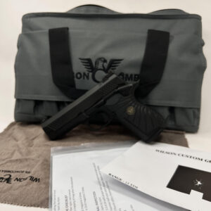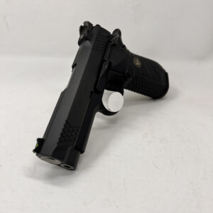Used WILSON COMBAT 1911 CQB ELITE COMPACT - 4" MATCH GRADE CONE BARREL w/FLUSH-CUT REVERSE CROWN - 45ACP - BLACK ARMOR-TUFF® The Close Quarters Battle Elite blows the competition away with a standard package of custom features designed to meet the needs of tactical shooting professionals. The CQB Elite package has a standard array of custom features designed to meet the needs of tactical shooting professionals, each selected with the input of experts in the field. Here’s what is standard: Bullet Proof® parts throughout, serrations on the top and the rear of the slide, Battlesight rear sight with fiber optic front sight, matching serrations on the back of the extractor, checkered mainspring housing and front strap for a sure grip and standard G10 grips with a tapered cut-out for easy access to the semi-extended magazine release button. If your requirements are for a compact custom carry pistol loaded with the most popular custom features, the CQB Elite Compact should fit the bill. Key Details: *Calibers: .45 ACP *Magazine capacity: 7 rounds *Barrel length: 4" *Overall length: 7.6" *Sight radius: 5.6" *Height: 5.1" *Width: 1.3" *Weight empty: 36.8 oz *Weight loaded: 41.5 oz *Accuracy guarantee: 1.5" at 25 yards Specifications: *Compact size Carbon Steel frame *High Cut checkered frontstrap *High-Ride Bullet Proof® beavertail grip safety *Tactical Bullet Proof® thumb safety *3 ½# – 4 ½# Crisp trigger pull with long length pad (three hole *Bullet Proof® magazine well *Bullet Proof® magazine release *G10 Starburst, flat bottom, Black Grips with Pewter medallions *4" Carbon Steel slide Battlesight with fiber optic front sight *4" Stainless match grade barrel and bushing, flush-cut reverse crown *30 LPI slide top serrations *40 LPI serrated rear of slide *Front and rear cocking serrations$4,457.00Original price was: $4,457.00.$3,188.00Current price is: $3,188.00. -