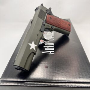 New Auto Ordnance Thompson Tanker M1 Carbine - 45ACP - Semiautomatic - 16.5" Barreled Tommy Gun w/20 & 30-Round Stick Mags + WWII Ammo Pouch & Kerr Sling Here is a .45 caliber semi-automatic version of the world's first and most famous military rifle. The Thompson M1 was used victoriously in battles throughout the world, inscribing its place for all times as a legend among military firearms. We offer the same attention to craftsmanship today that made the original so highly regarded. The look and feel are authentic, right down to the side bolt action. The frame and receiver are milled from solid steel or aluminum, the wood is genuine American walnut and the overall finish is a blued steel or black anodized aluminum. "Built like a tank" is a phrase that has entered the American lexicon as a means to describe hardware that is durable, strong and nearly indestructible. The term may have originated in describing armored fighting vehicles, but it also clearly describes the Tommy Gun. It is only fitting then that Auto-Ordnance continue the series of WWII commemorative guns with the "Tanker Thompson", dedicated to the memory of the brave American soldiers who faced the enemy in steel chariots like the M4 Sherman Tank. Nearly 50,000 Shermans were produced during World War II, seeing action primarily in Europe against Nazi Germany. Just like the Thompson, these Shermans were a vital part of the war effort. The crews that took them into harm's way were often outgunned by German tanks, but nevertheless took the fight to the enemy and achieved victory despite the odds. Auto-Ordnance is proud to honor America's armored warriors with this commemorative Thompson. Each Tanker Thompson is Cerakoted in Army O.D. Green. The white star of the Sherman Tank is engraved just in front of the mag well. The "U.S" logo is engraved on the buttstock. Like every Thompson, the gun is all steel with high grade walnut furniture. The 16.5" barrel is exceptionally accurate. Owning the Tanker Thompson gives the modern shooter the opportunity to own a piece of history, while honoring the memory of the brave tank crews who delivered on America's promise to achieve final victory in World War II.$2,366.00Original price was: $2,366.00.$2,188.00Current price is: $2,188.00. -