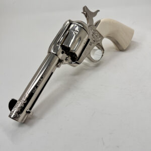 Used Original GEN III 1873 COLT SINGLE ACTION ARMY NICKEL w/PRE-BAN ELEPHANT IVORY GRIPS - Built in the COLT CUSTOM SHOP - 4.75" BARREL - 45 COLT CHAMBERING No Colt revolver has earned greater fame than the single action army – The Peacemaker. In design and performance, in line and form, no more sculptural and practical Colt has ever been created. Movies serve as constant reminders of the role this equalizer played in winning the West. This SAA features a nickel barrel, cylinder and frame finished with a pre-ban set of elephant ivory grips. A true Custom Shop offering with subtle engraving around the front sight and just above and behind the single action trigger completed by a Colt Master Engraver. Generation III. Produced in 1990 with serial #SA93004.$8,800.00 -