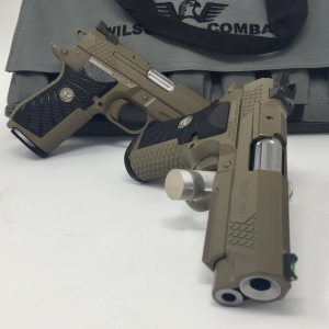 WILSON COMBAT-SIG SAUER WCP320 - BLACK over FDE - Straight trigger with custom trigger job Wilson Combat and SIG SAUER are pleased to announce the availability of a Wilson Combat enhanced P320 9mm semi-automatic pistol collaboration, the WCP320. Wilson Combat gunsmiths and engineers have completely reworked a SIG SAUER P320 chassis and unfinished SIG manufactured slide into our ideal version of a high performance, perfected striker-fired pistol. Using the all-new Wilson Combat SIG P320 grip module, our in-house re-machined slide and Wilson Combat performance battle sights, the Wilson Combat Optimized WCP320 will become the new standard in hard-use, striker-fired handguns. Our modifications have tailored and tuned the 320 platform for precision tactical pistol shooting. This robust, fast handling pistol wears our Wilson Combat engineered polymer grip module. This newly designed and manufactured grip has enhanced traction, smoother reloading, improved pointablity and superb recoil control in dynamic shooting. This grip turns an already solid platform into an ergonomic shooting machine. The slide has been machined with the Wilson Combat X-TAC pattern for improved manipulation under stress. The front and rear cocking serrations, as well as the slide top, wear this signature Wilson Combat pattern. The stainless steel slide and chromoly barrel wear the most advanced black DLC (Diamond-like-Carbon) physical vapor deposition finish available. This finish has chromium and tungsten underlayers for long lasting corrosion and abrasion resistance. The SIG SAUER flat-faced XFULL trigger is standard on the WCP320 and gives shooters a lower finger position on the trigger which increases leverage for a lighter, smoother trigger pull. The pull has been further enhanced by Wilson Combat gunsmiths with our optional action tune using Grayguns custom trigger parts.$1,469.00SPECIFICATIONS