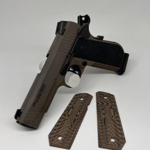 Sig Sauer 1911 Emperor Scorpion Fastback Carry - 45ACP **$100 extra for VZ Punisher Grips A scaled-down version of the 1911 Full-Size the SIG Sauer 1911 Compact is a small and lightweight semi-automatic handgun chambered in 45 ACP with a 7 + 1 capacity. Like its full-sized counterpart this pistol combines the classic century-old design of the 1911 with modern technology. The stainless steel frames and slides are precision machined for lasting reliability and performance and complemented by clean lines. The 1911 Compact also features a crisp trigger pull and exceptional ergonomics and is an ideal choice for personal protection. DETAILS: Beauty and legendary SIG SAUER reliability combine in the 1911 Fastback Emperor Scorpion Carry. This pistol features a stainless steel frame with rounded grip and mainspring housing in addition to a traditional contour slide. Finished with a custom Flat Dark Earth PVD finish, the Fastback Emperor Scorpion stands out from the crowd. Extremely durable and wear resistant, the physical vapor deposition is corrosion resistant, and provides a stunning look to Emperor Scorpion variants. Rounding out the look, each Emperor Scorpion is fitted with dark Piranha textured G-10 magwell grips and dark controls. Forward cocking serrations and SIGLITE night sights complete the package. CALIBER: 45 Auto ACTION TYPE: Semi-Auto MAGS INCLUDED: (2) 8rd Steel Mag SIGHTS: SIGLITE Night Sights SIGHT RADIUS: 5.7 in (145 mm) GRIP TYPE: Black G10 FRAME SIZE: Carry FRAME FINISH: Flat Dark Earth PVD FRAME MATERIAL: Stainless Steel SLIDE FINISH: Flat Dark Earth PVD SLIDE MATERIAL: Stainless Steel TRIGGER: SAO TRIGGER PULL: SA 5 lb (22 N) BARREL LENGTH: 4.2 in (107 mm) OVERALL LENGTH: 7.7 in (196 mm) OVERALL WIDTH: 1.4 in (36 mm) HEIGHT: 5.5 in (140 mm) WEIGHT: 35 oz (992 g)$1,499.99Original price was: $1,499.99.$1,299.00Current price is: $1,299.00. -
