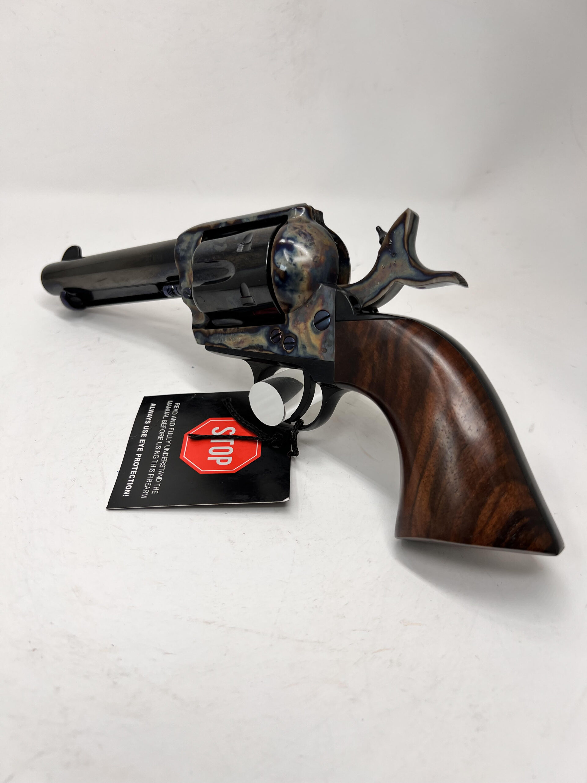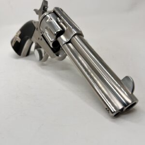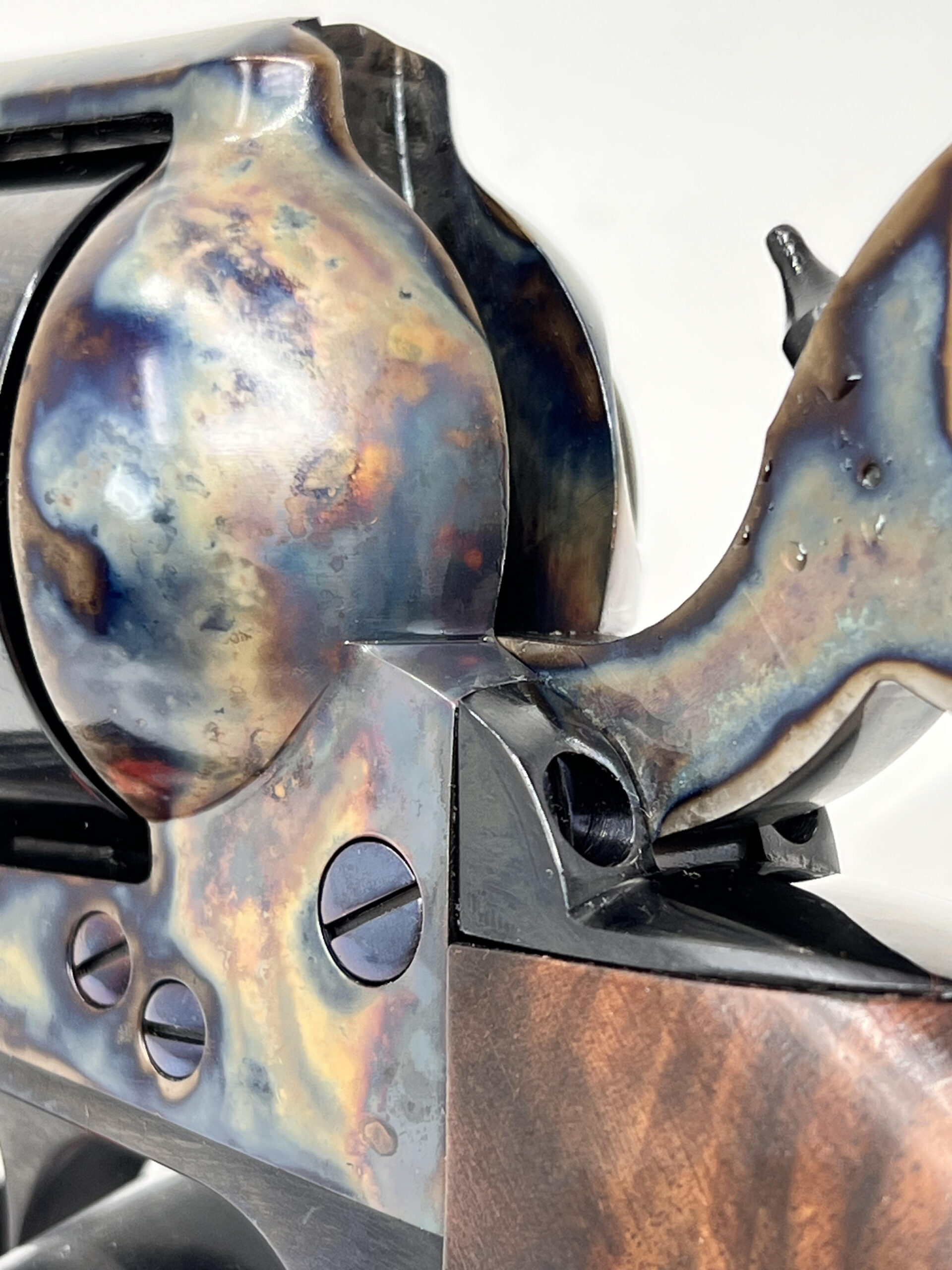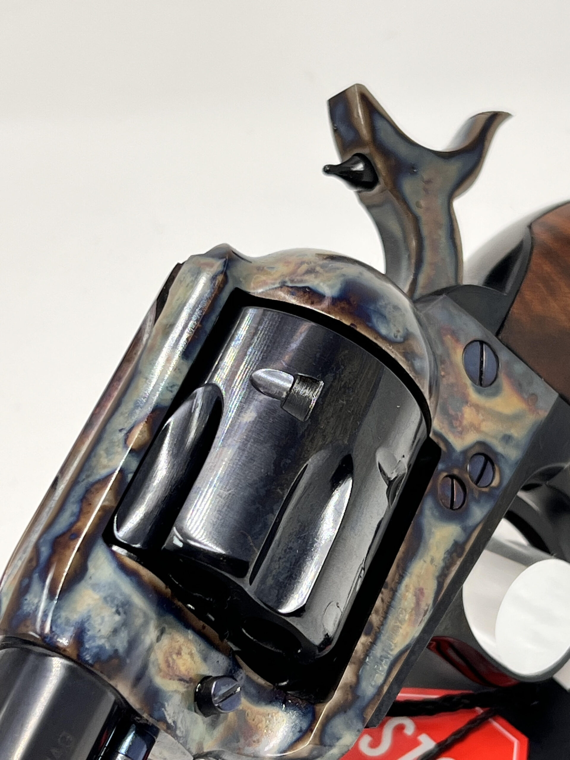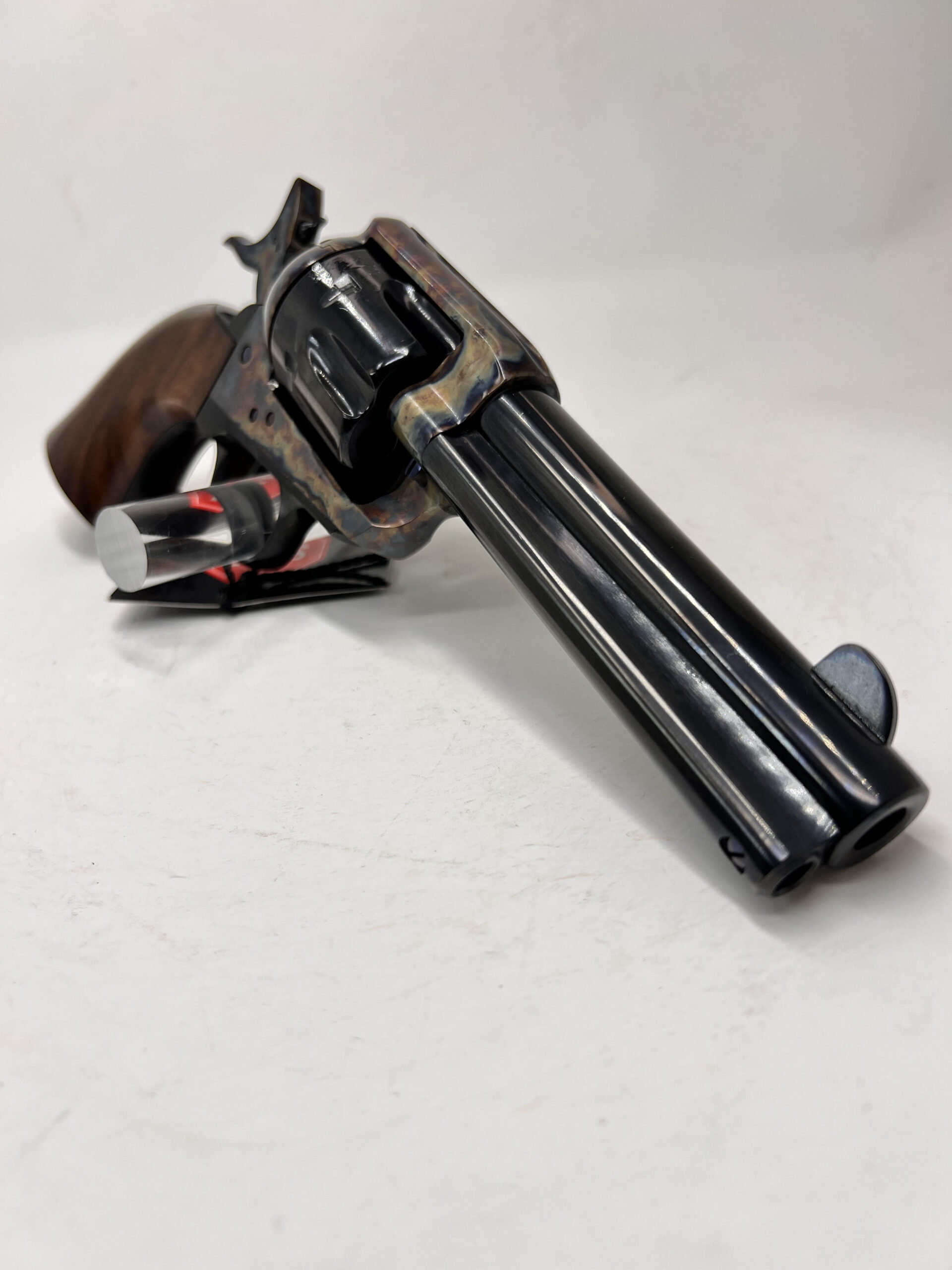 This Pietta Pre-War Custom Shop Migliore model 1873 Colt Single Action Army is chambered in 357 Magnum and is one of 250 that will ever be produced. The action is incredibly smooth and its accuracy will amaze you. This 4.75” barreled Peacemaker revolver is an exacting replica down to the same weight, size, performance and feel. It has a floating hammer pin as opposed to safety transfer bar and the iconic 4 clicks to bring the hammer to full cock. Parkwest Arms was recruited to contribute the color case-hardening process on the frame and hammer using the traditional bone and charcoal method. A deep gloss blued finish for the rest of the gun was considered a requirement among all parties. The hand set nitride-blued ejector pin, cylinder release pin, and screws serve as a testament to the meticulous attention to detail and refinement. The Migliore’s one-piece grip is carved from high-grade walnut and the completed look, we believe, speaks for itself.
