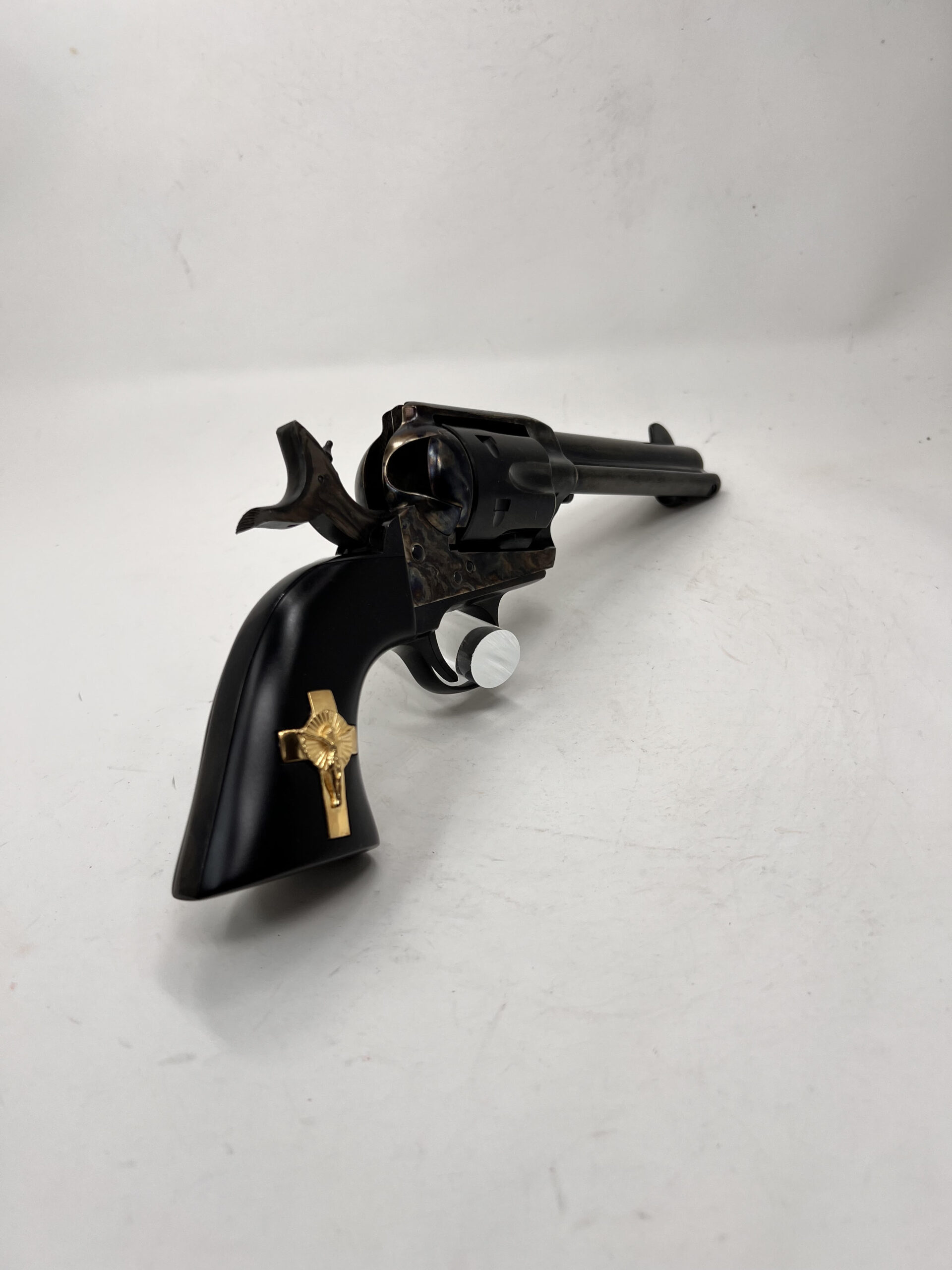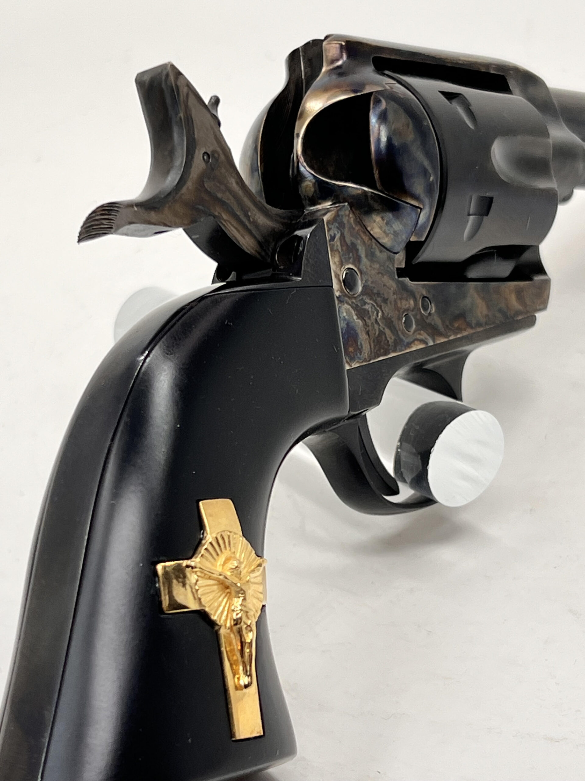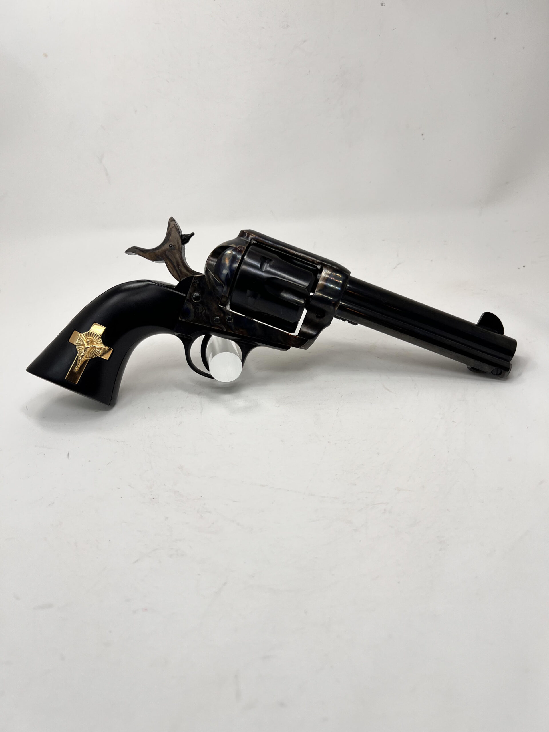 New PIETTA FRONTIER “HANDS of GOD” 45LC 4.75” HOLY SMOKER® – “3:10 to YUMA” – BLUED & COLOR CASE HARDENED w/INLAID GOLD PLATED STERLING SILVER CRUCIFIX – 4-CLICKER