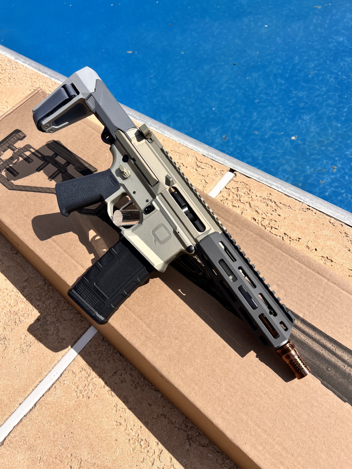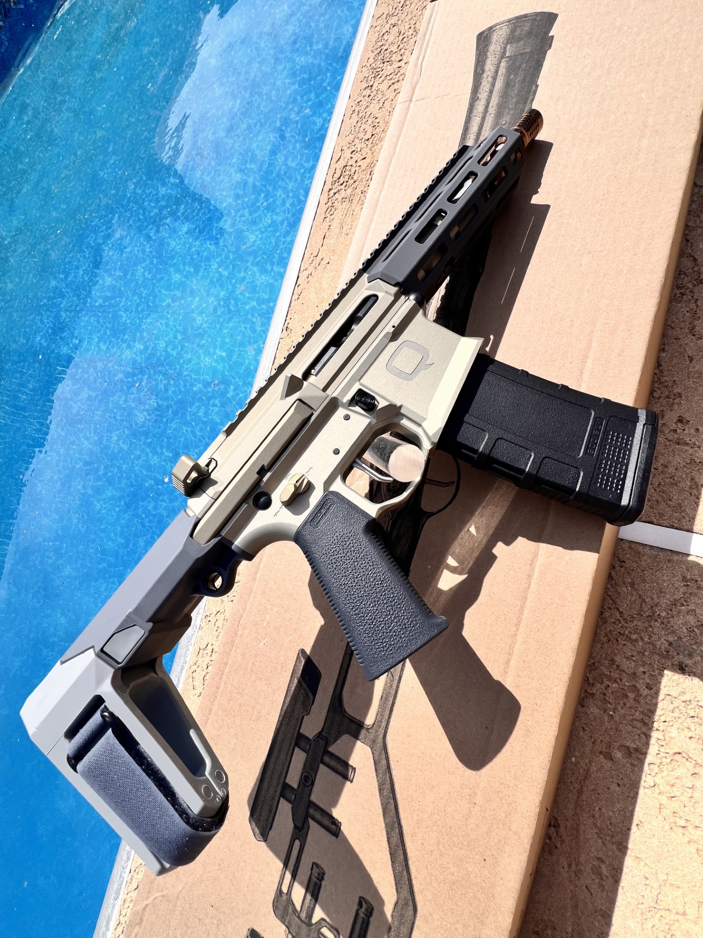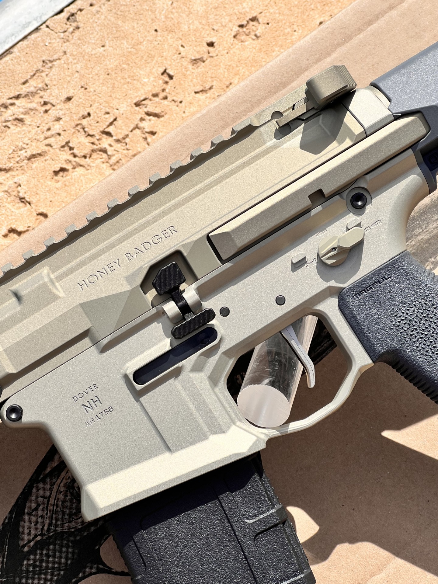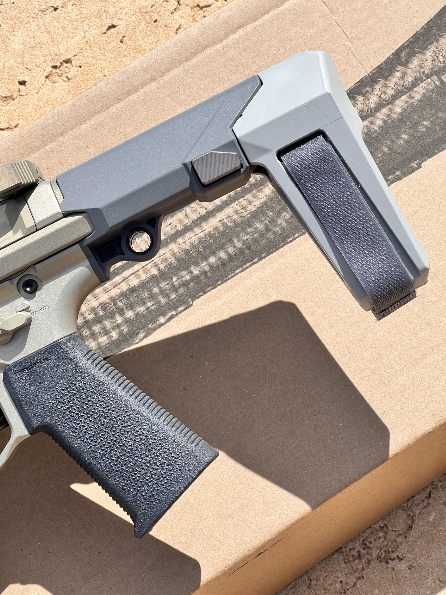 New Q LLC HONEY BADGER 300BLK – 7″ MATCH GRADE BARREL – 1:5 TWIST w/ADJUSTABLE GAS BLOCK – TAN/GRAY PISTOL w/BRACE