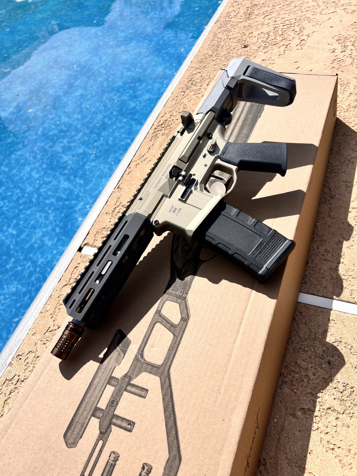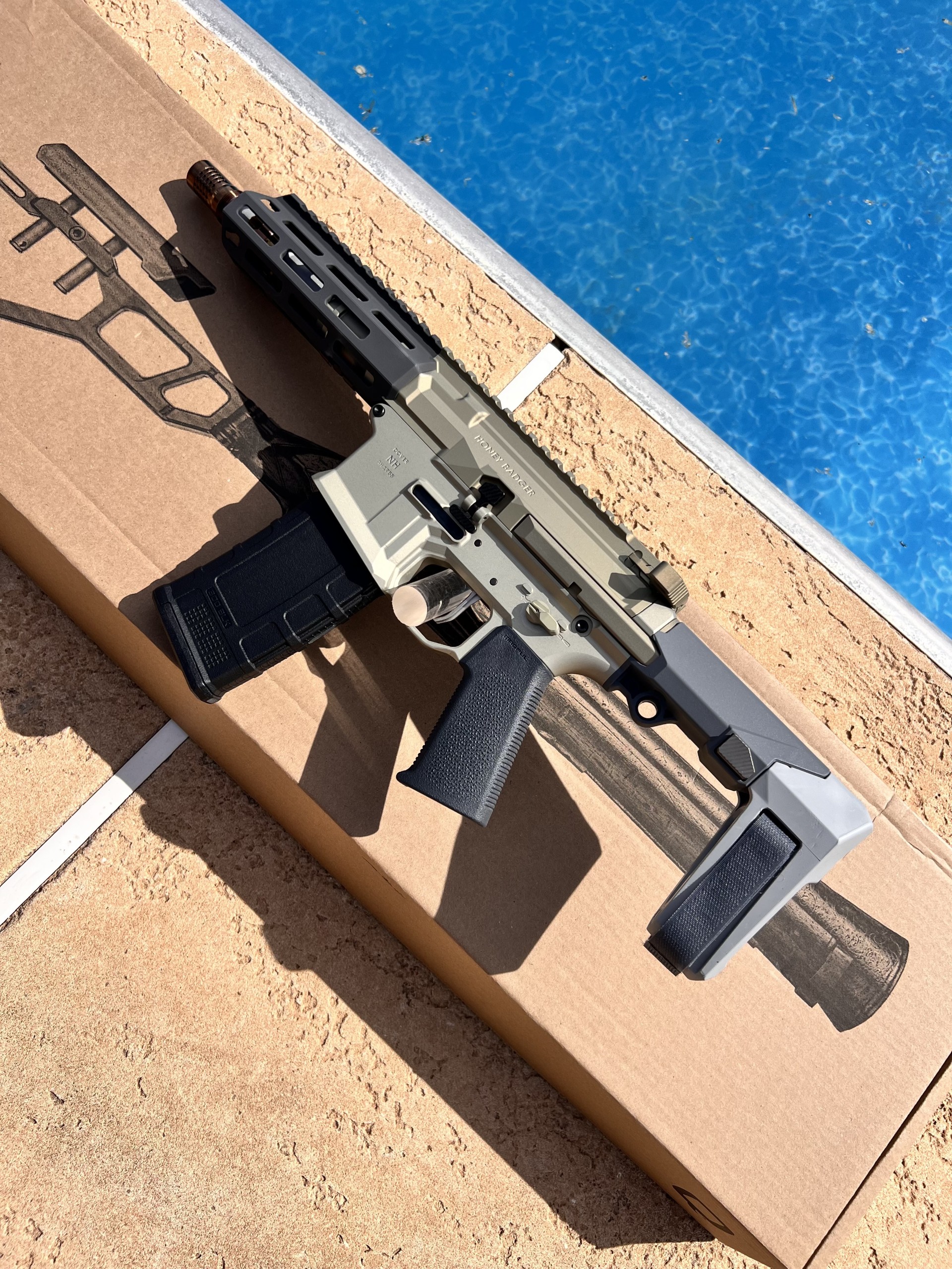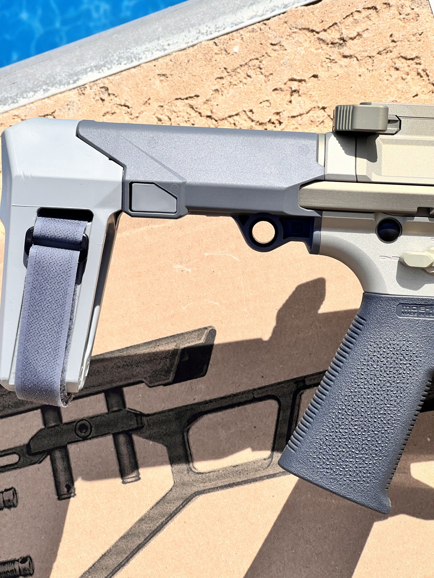 New Q LLC HONEY BADGER 300BLK – 7″ MATCH GRADE BARREL – 1:5 TWIST w/ADJUSTABLE GAS BLOCK – TAN/GRAY PISTOL w/BRACE