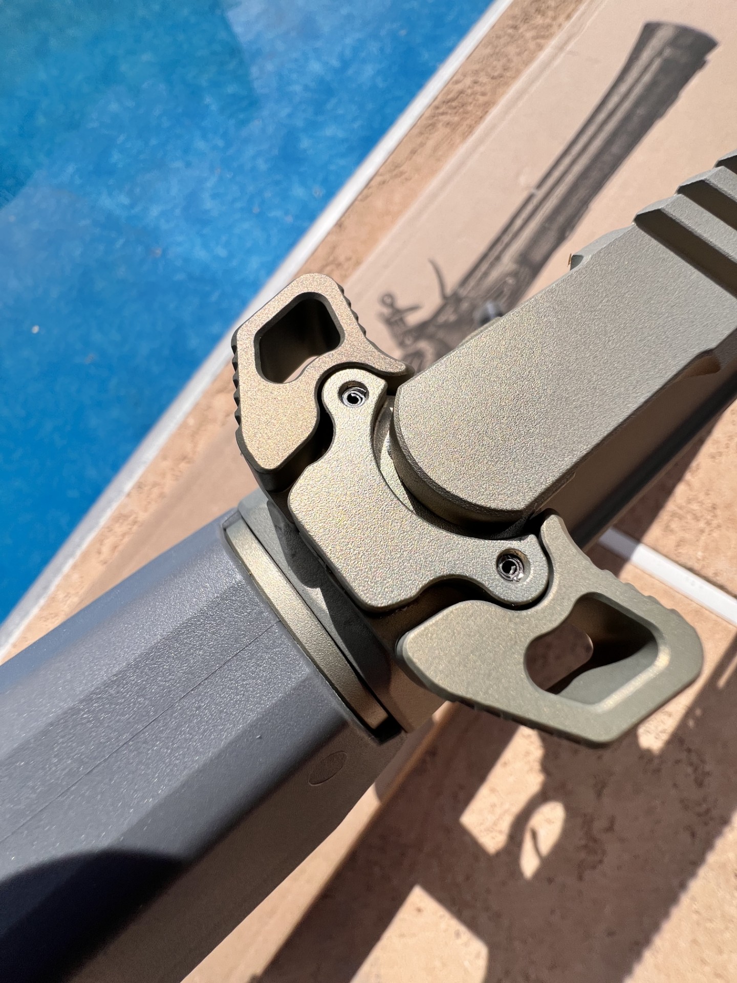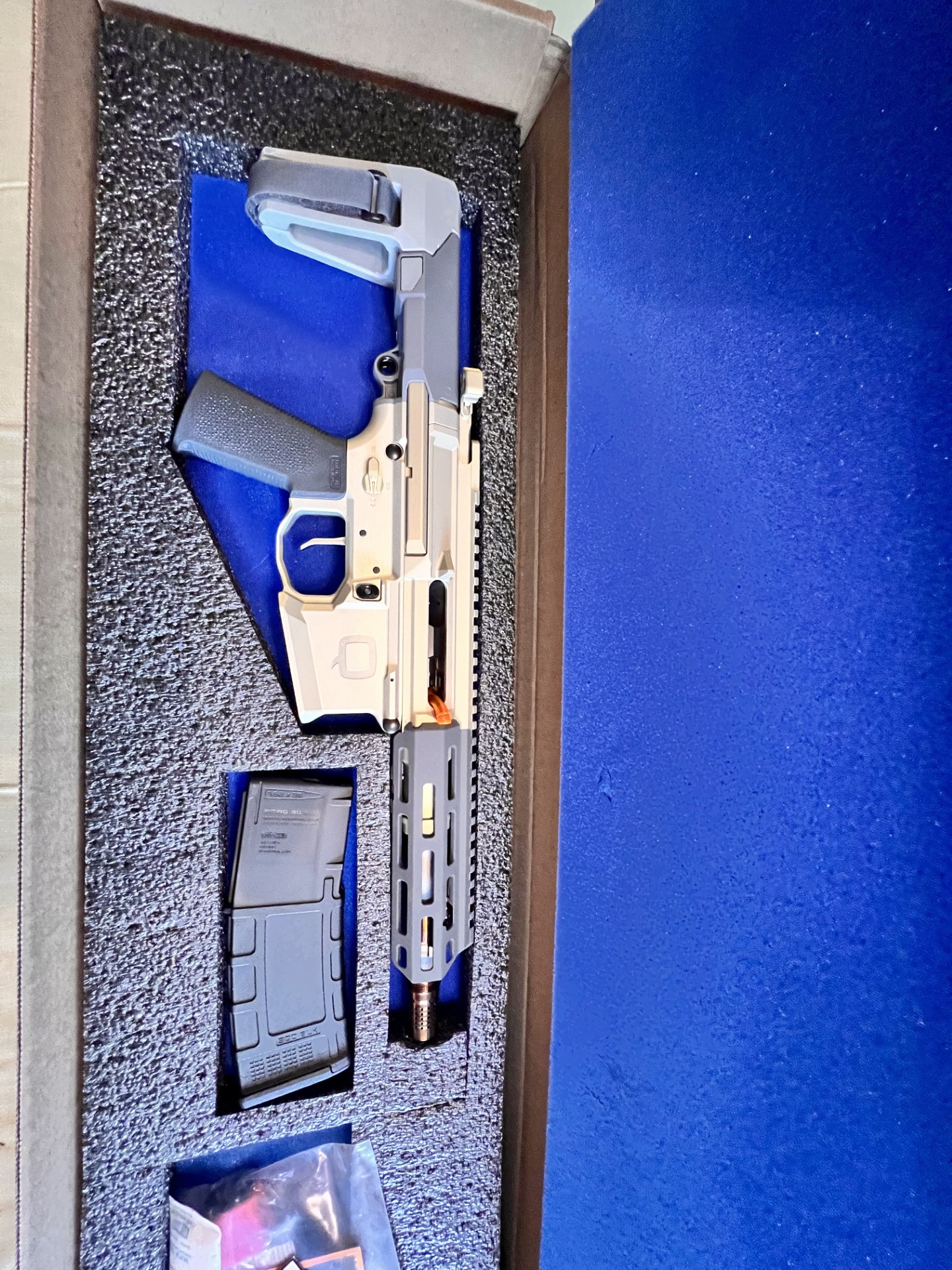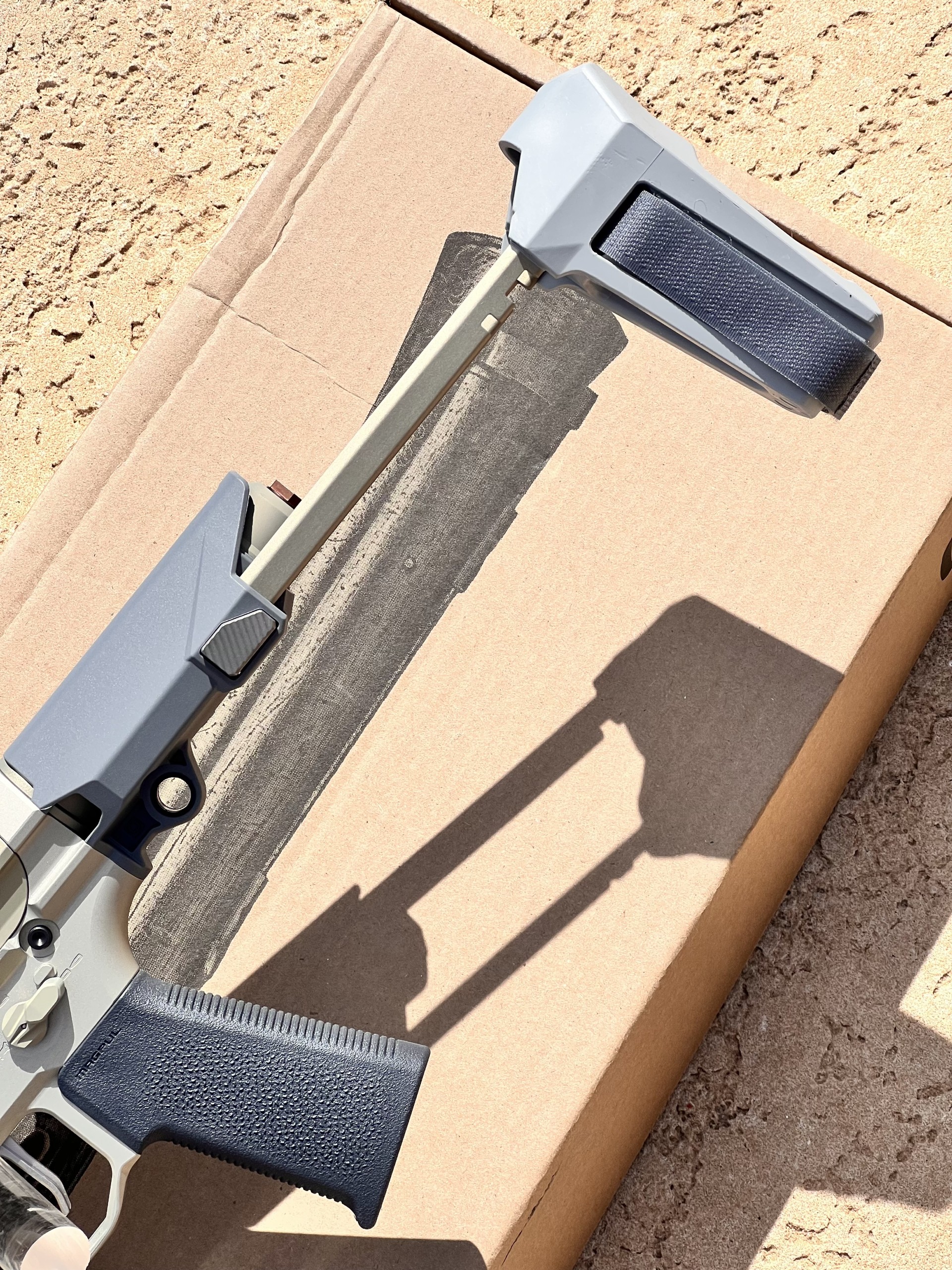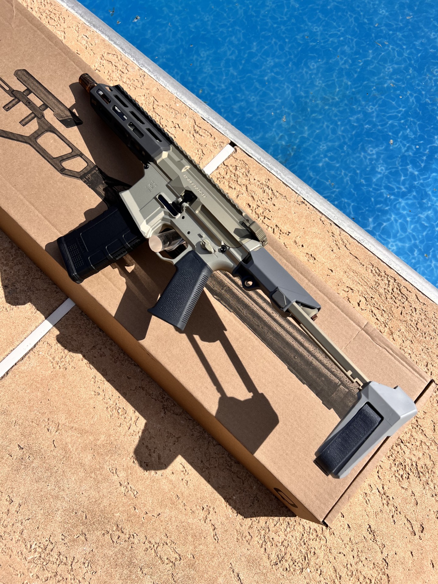 New Q LLC HONEY BADGER 300BLK – 7″ MATCH GRADE BARREL – 1:5 TWIST w/ADJUSTABLE GAS BLOCK – TAN/GRAY PISTOL w/BRACE