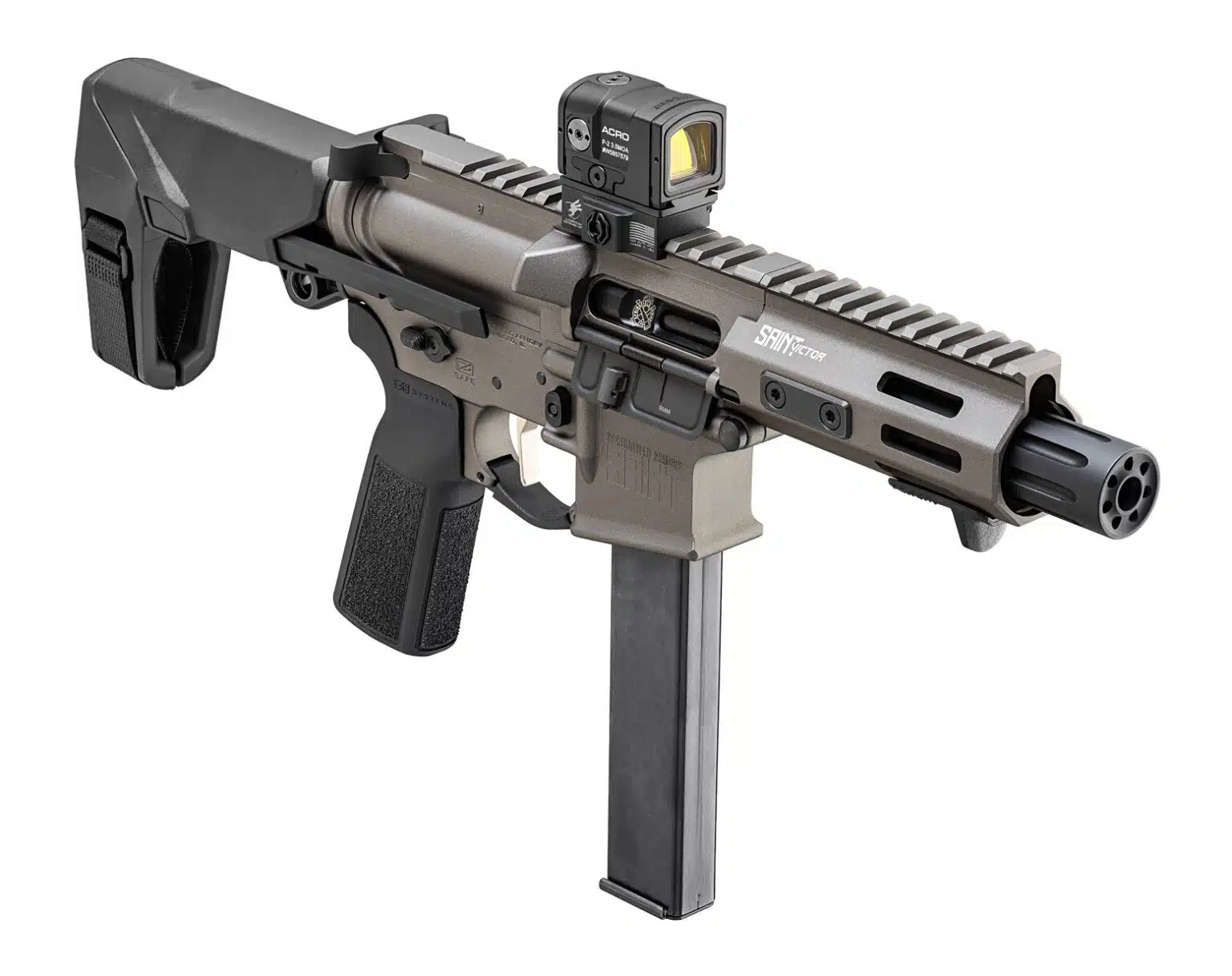 The SAINT® Victor 9mm PDW delivers rugged performance in a compact, hard-hitting package. Its 5.5″ barrel and SB Tactical HBPDW™ brace create a short, maneuverable platform built for tight spaces. Forged upper and lower receivers provide a rock-solid foundation, while the full-length top Picatinny rail offers ample room for optics and accessories. A direct blowback system provides time-tested reliability, feeding from standard 32-round Colt®-pattern magazines.