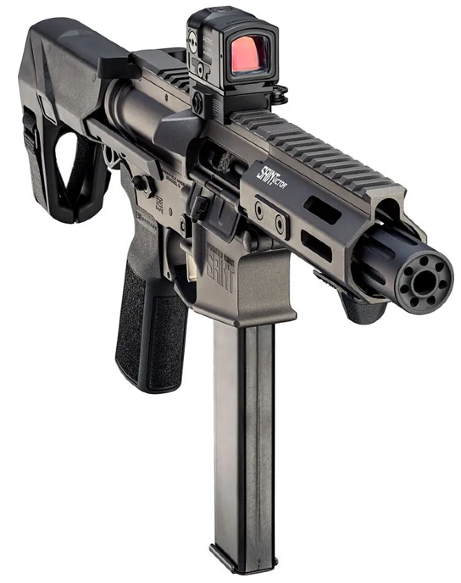 The SAINT Victor PDW feeds from a Colt-pattern 32-round magazine.