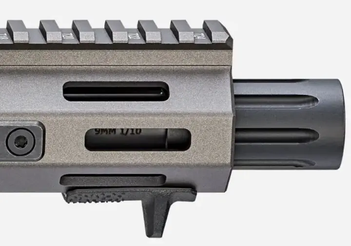 Beneath the aluminum handguard sits a 5.5″ CMV 9mm barrel finished in nitride. The removable muzzle device exposes 1/2-28 threads for direct suppressor attachment.