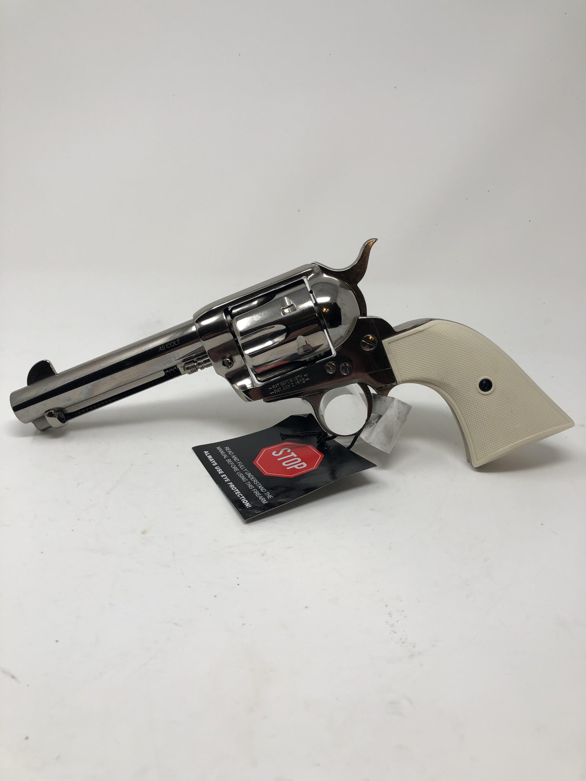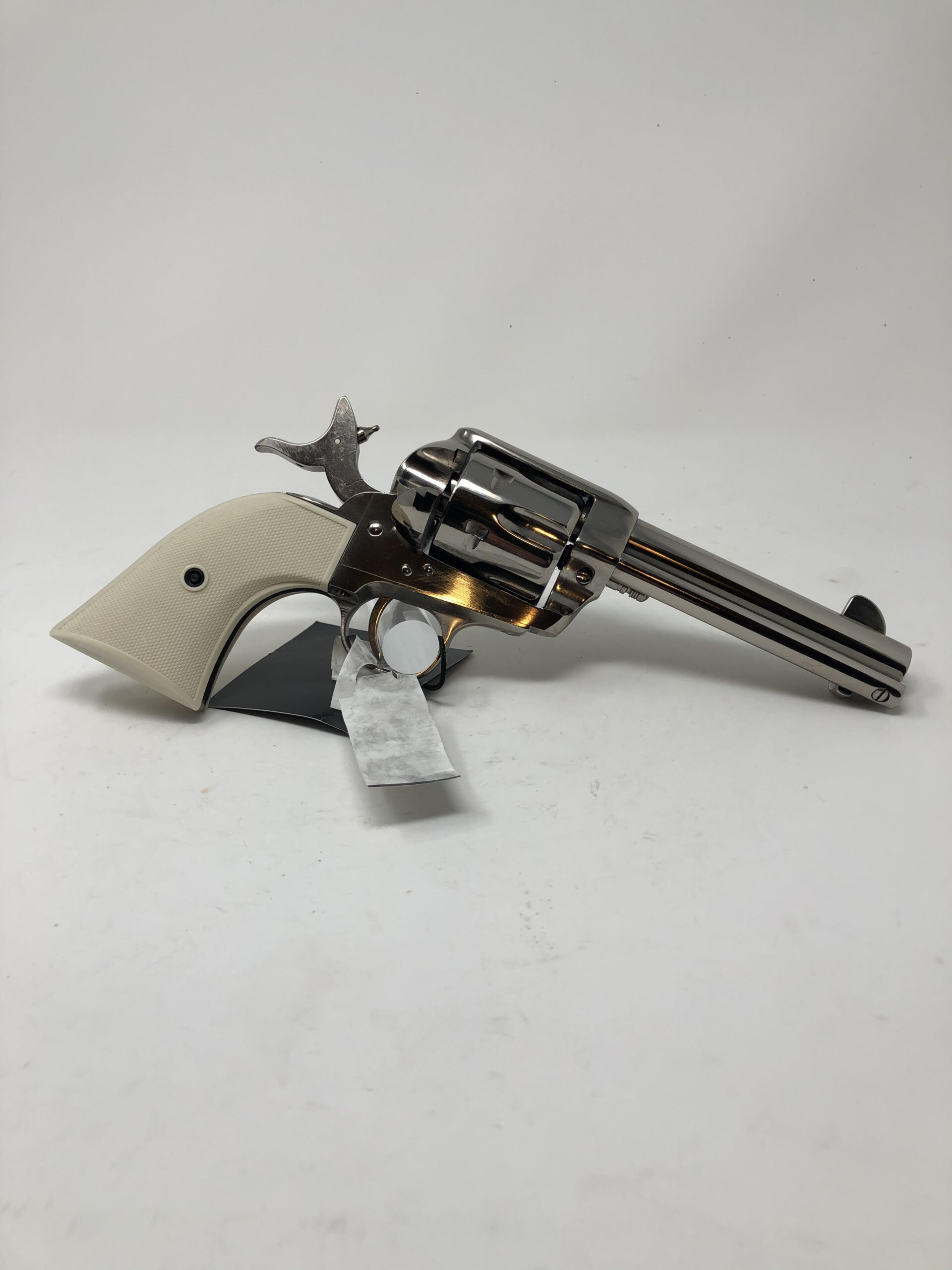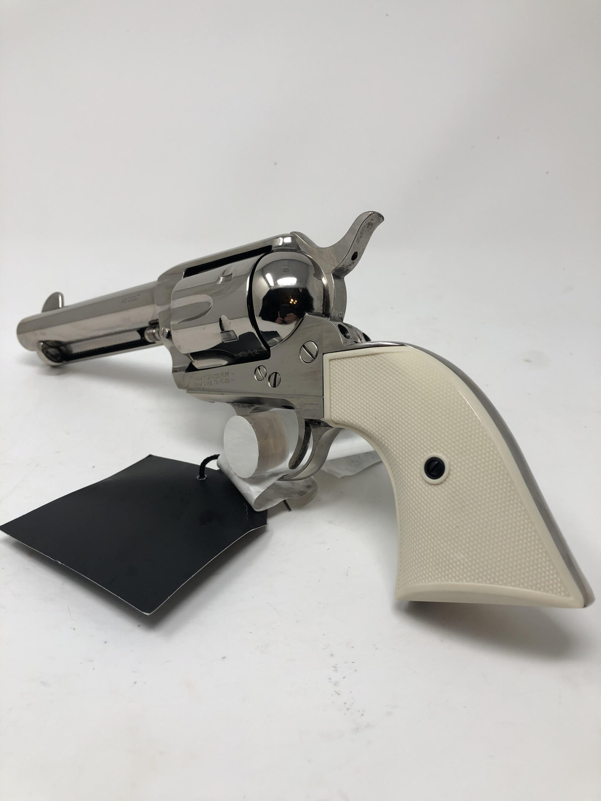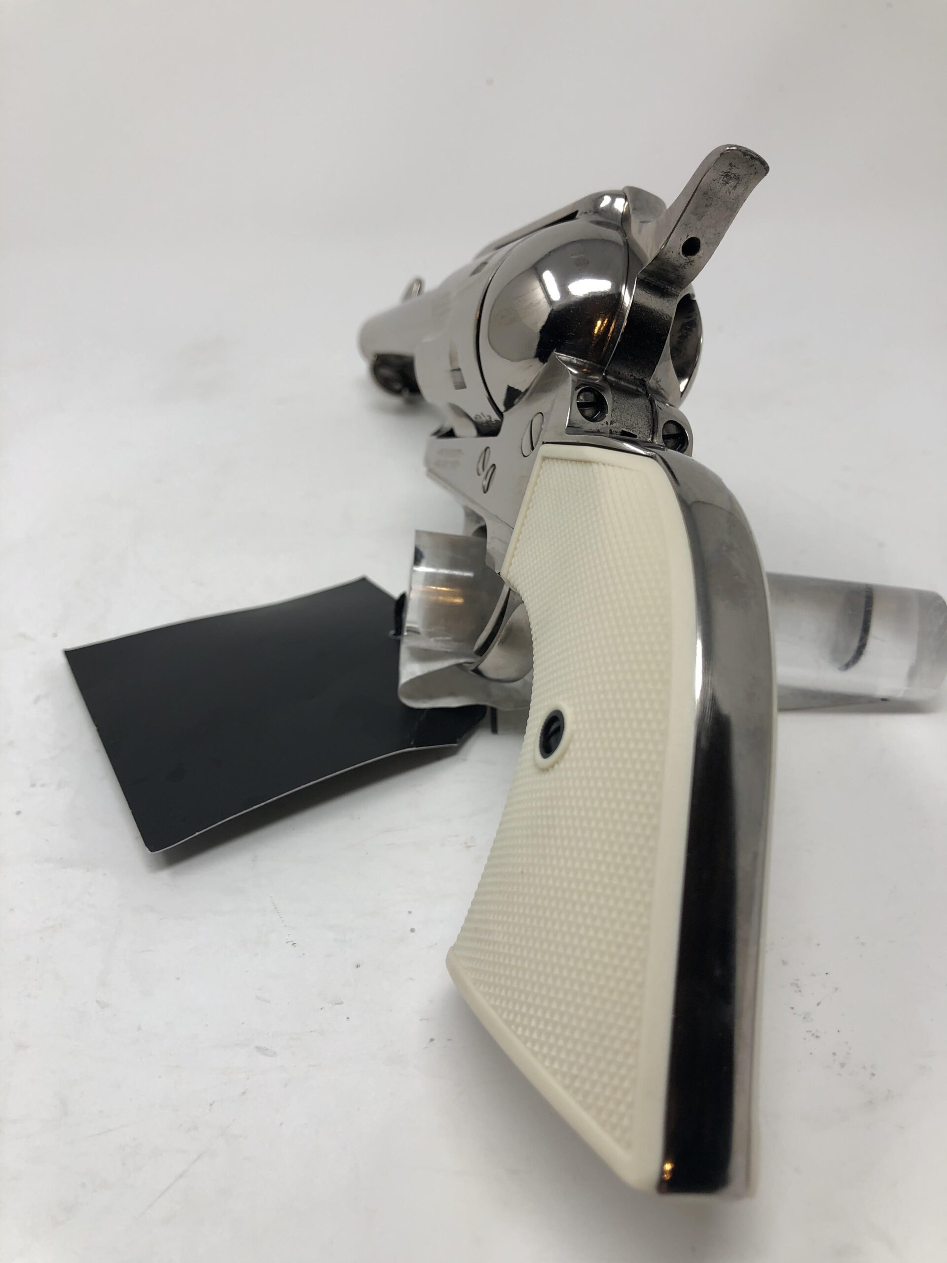 Pietta 1873 Single Action Army 4.75” 45LC. Gunfighter model. Checkered faux ivory grips. Nickel finish. 4-clicker.