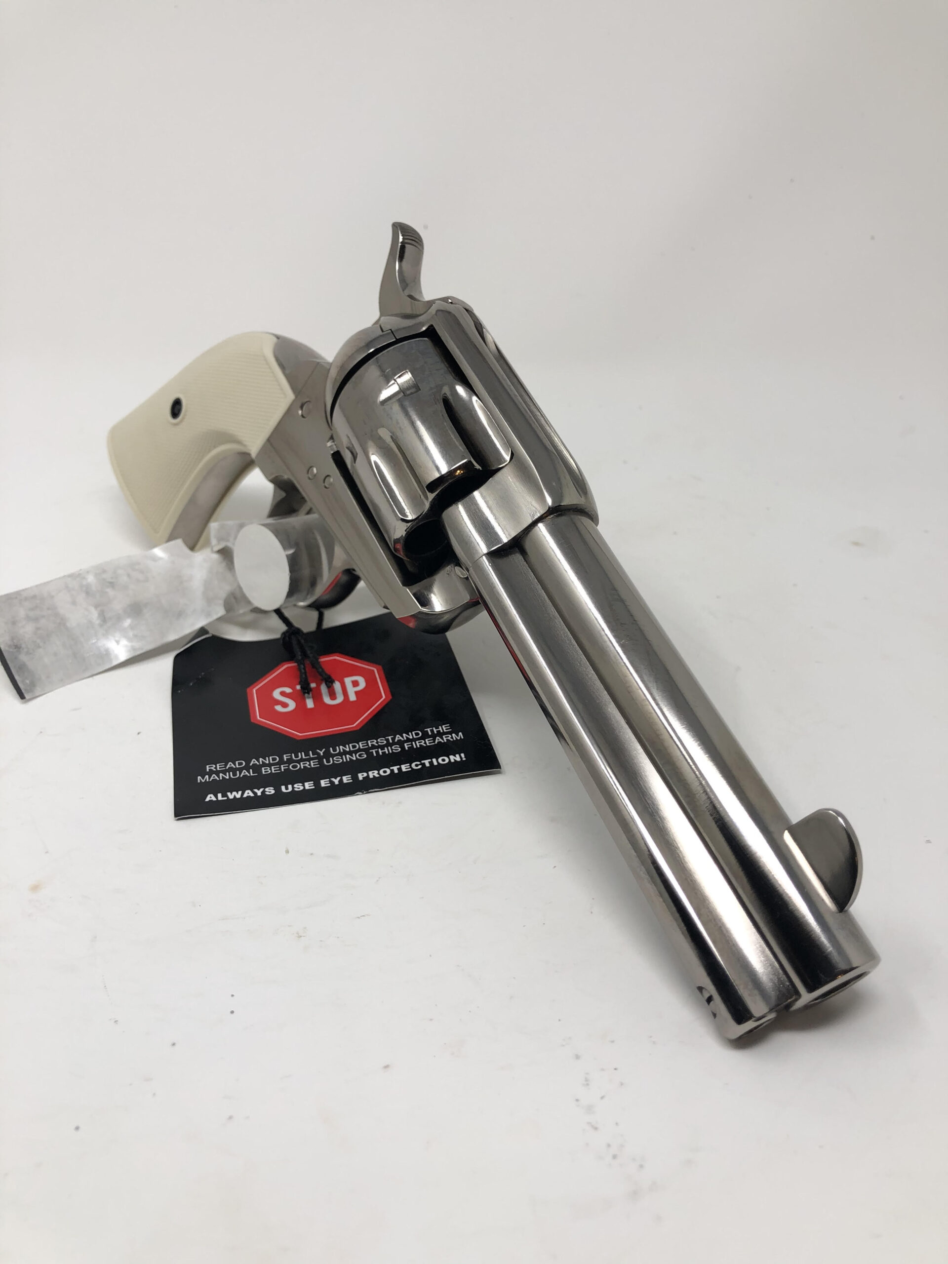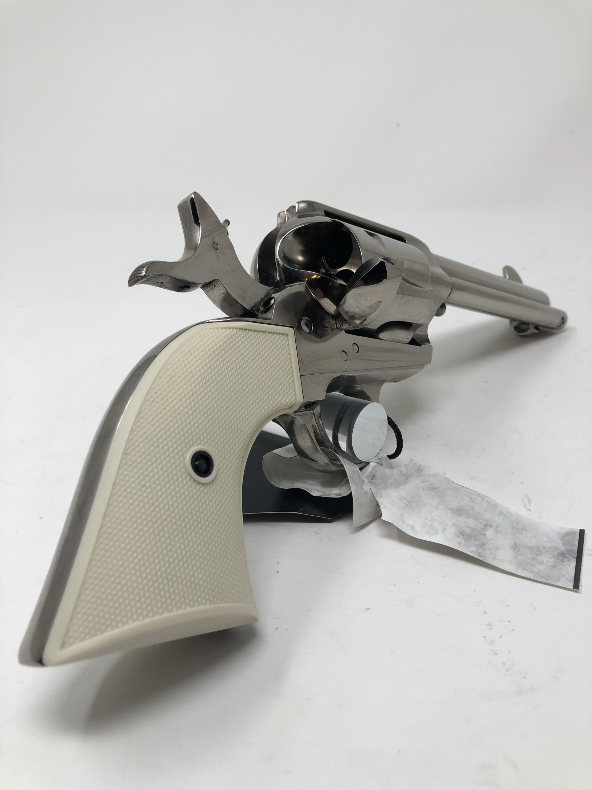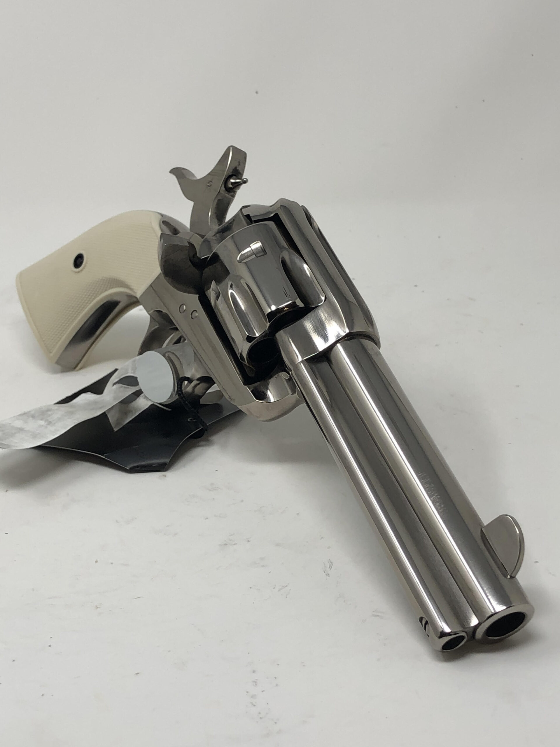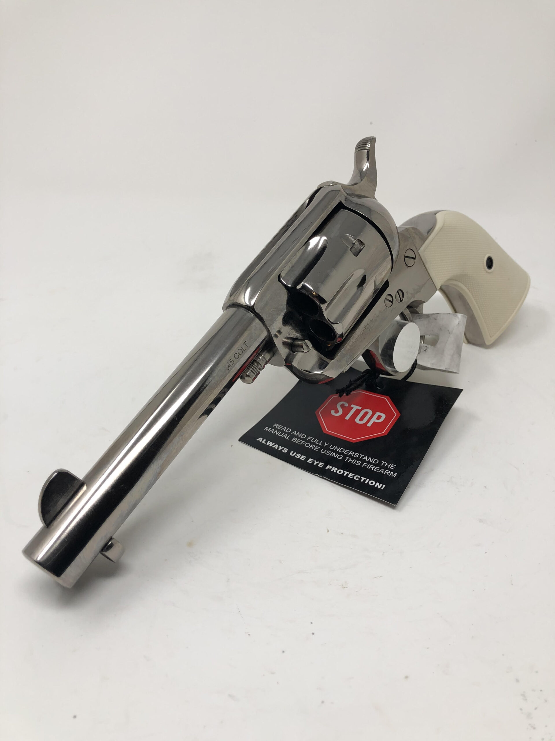 Pietta 1873 Single Action Army 4.75” 45LC. Gunfighter model. Checkered faux ivory grips. Nickel finish. 4-clicker.