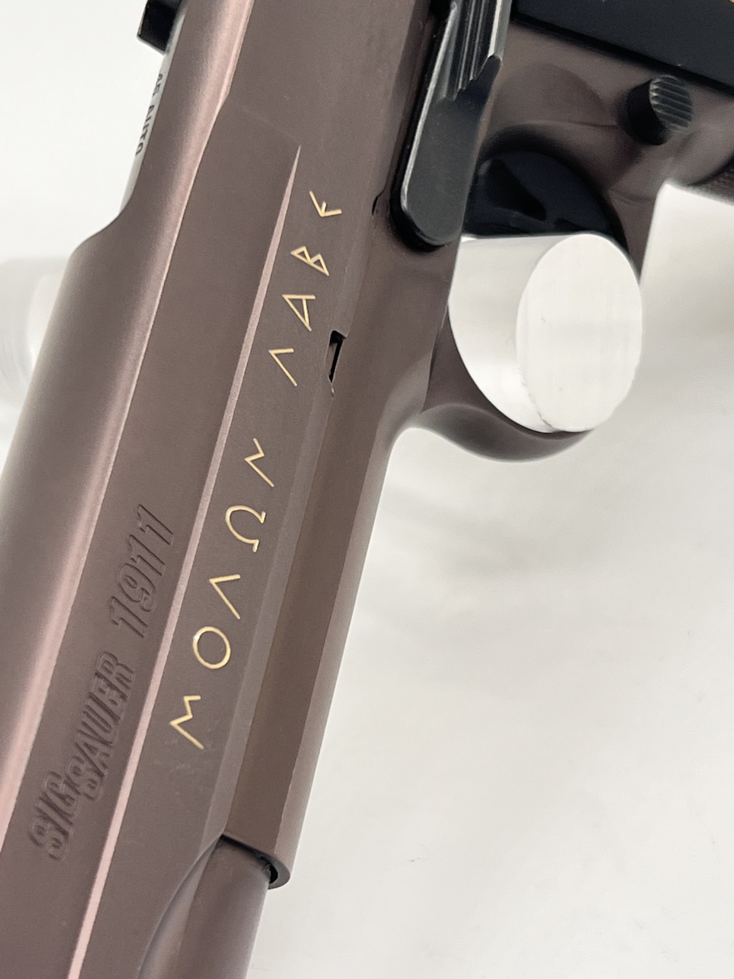 Single action only. Stainless steel frame and slide with an oil-rubbed bronze Nitron finish which is a thin layer of amorphous DLC (Diamond Like Coating) that both creates a hard protective coating and enhances lubricity. The low profile Siglite night sights are a great option if needed. The Hogue Spartan grip panels feature the script inscribed on the marble of the 1955 Leonidas monument at Thermopylae with an ancient Greek helmet. The engraved slide features a 24kt gold inlay reading “Molon Labe” which is an ancient Greek saying meaning “Come and Take Them.” The beavertail-type steel grip safety has a pronounced bump on the bottom to insure that it is disconnected for firing even if not depressed completely and adds an additional layer of safety. The Spartan’s trigger can be adjusted for overtravel and take-up and it breaks crisply without a trace of creep with a pull weight of exactly 3.75 pounds.